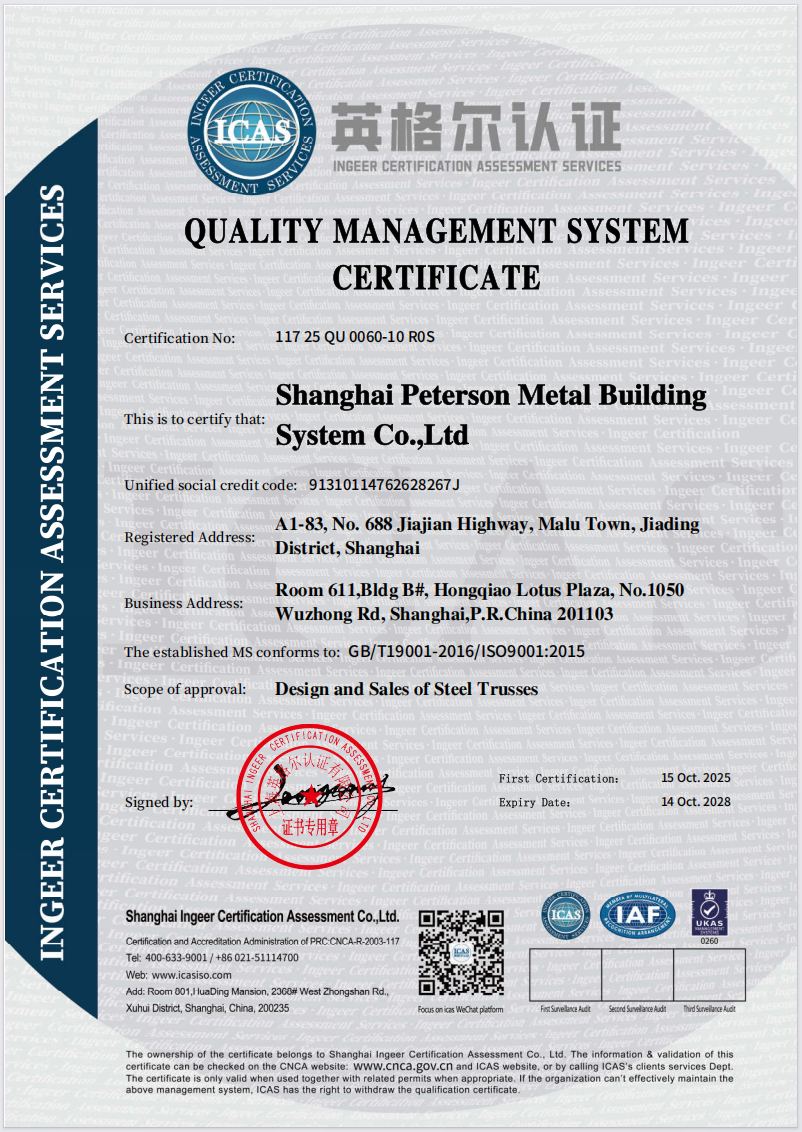 Peterson Steel Joist can produce over 5000 tons of various steel products annually, including R-K serial Joist, F-LH serial Joist, DH serial Joist and S serial Space Joist with its production bases in Taian, Shandong Province,Sales Office in Shanghai of P.R. China.
